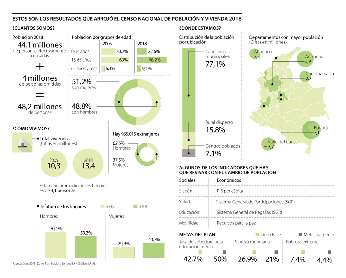 Y es que todas las metas de la hoja de ruta del próximo cuatrienio, desde la de sacar a 2,9 millones de personas de la pobreza monetaria a 2022 hasta la de llegar a dos millones de niños con educación inicial, se proyectaron teniendo en cuenta que en Colombia viven 42,8 millones de personas como arrojó el Censo de 2005 y no 48,2 millones, es decir, 5,4 millones más, como reveló la semana pasada el director del Dane, Juan Daniel Oviedo.