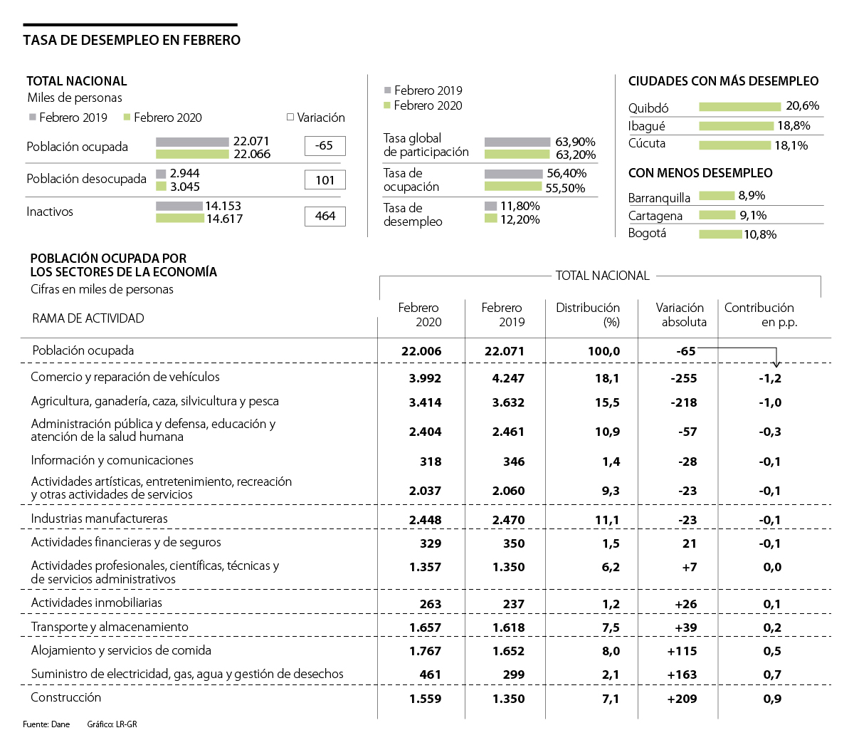 El Departamento Administrativo Nacional de Estadística (Dane) reveló que la tasa de desocupación subió a 12,2% en el segundo mes del año, una cifra que fue generada por 65.000 personas que perdieron sus puestos de trabajo y los sectores de comercio y agricultura fueron los más golpeados al tener la destrucción más alta de empleos.