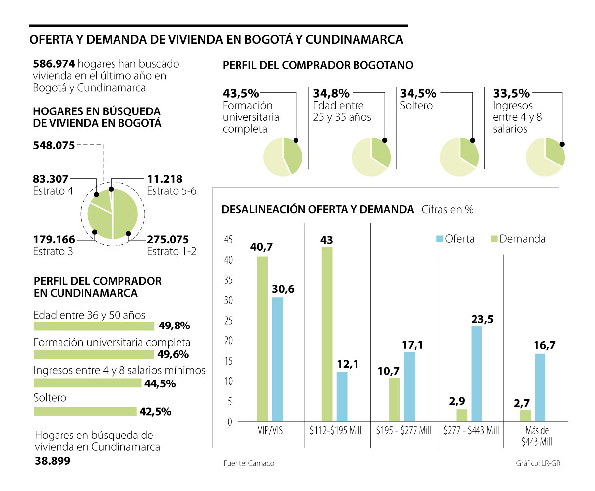 En el último año más de 586.974 hogares buscaron vivienda en Bogotá y Cundinamarca. De acuerdo con un estudio de Camacol, sobre la oferta y demanda en el sector, los rasgos más comunes entre quienes están buscando vivienda en la capital es que suelen ser adultos jóvenes, entre 25 y 35 años, que ganan más de $3,31 millones y con formación universitaria completa y solteros.