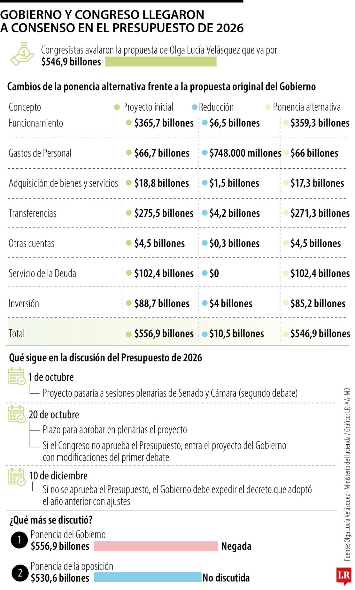 Las comisiones económicas del Congreso aprobaron la propuesta alternativa de Presupuesto para 2026 por un monto de $546,9 billones. Esta iniciativa fue presentada por Olga Lucía Velásquez, representante de la Alianza Verde y coordinadora dentro del trámite que se está llevando a cabo en el Legislativo.