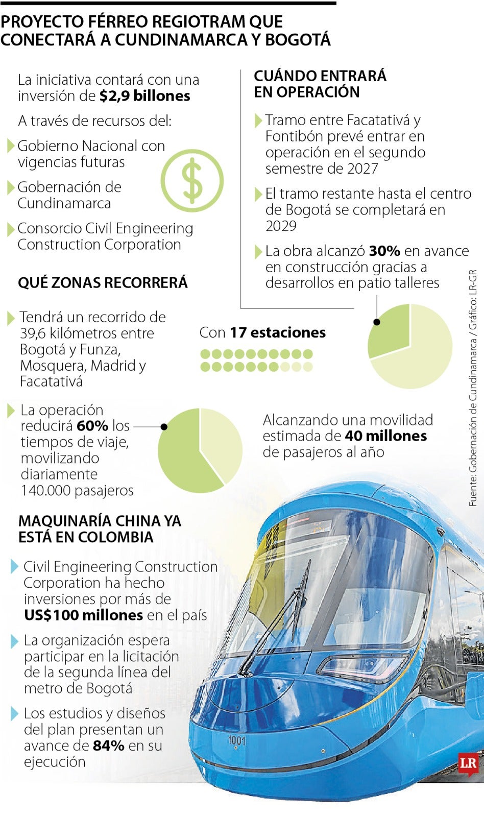 El proyecto Regiotram de Occidente entró en fase de construcción. La iniciativa, que contempla una inversión de $2,9 billones, se financia con recursos del Gobierno Nacional, la Gobernación de Cundinamarca y el consorcio chino Civil Engineering Construction Corporation.