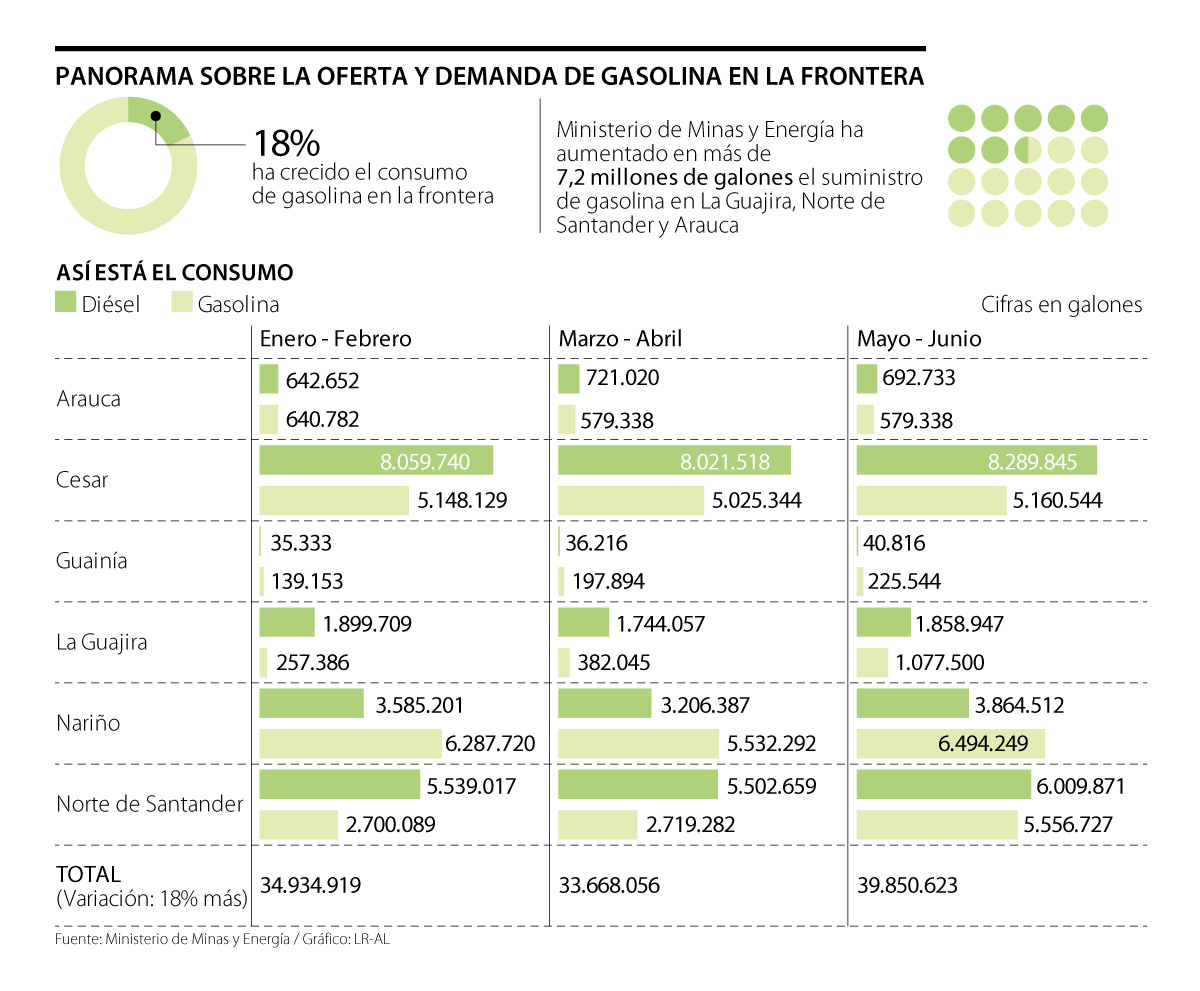 Y es que este fenómeno que se vive en los seis departamentos de frontera (Arauca, Cesar, Guainía, La Guajira, Nariño y Norte de Santander) ha obligado al Gobierno Nacional a aumentar la oferta o suministro de gasolina para evitar el desabastecimiento. Según cifras del Ministerio de Minas y Energía, desde principios de este año se han tomado medidas especiales en las que se ha incrementado en más de 7,2 millones los cupos de los combustibles.