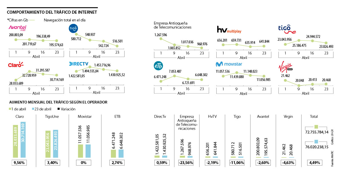 Según registros que lleva la Comisión de Regulación de Comunicaciones (CRC), el movimiento de gigas (Gb) promedio al día en marzo fue de 62 millones, mientras que en lo corrido de abril va en más de 75 millones de Gb; es decir, un alza superior a 20% en cuanto al uso de internet.