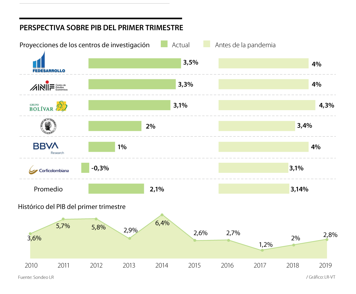 Así las cosas, al promediar las proyecciones de seis grupos de estudios económicos del país, incluyendo al equipo técnico del Banco de la República, se concluye que el PIB del primer trimestre sería cercano a 2,1%.