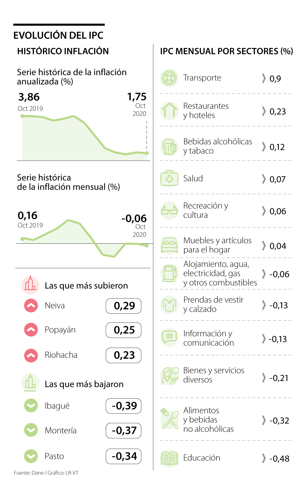El Departamento Administrativo Nacional de Estadística (Dane) reveló que en octubre la variación mensual de la inflación fue -0,06%, ello está muy por debajo de las proyecciones de los 25 principales analistas de mercados financieros que proyectaban un promedio de 0,14% al alza, según la encuesta de expectativas de Citibank.