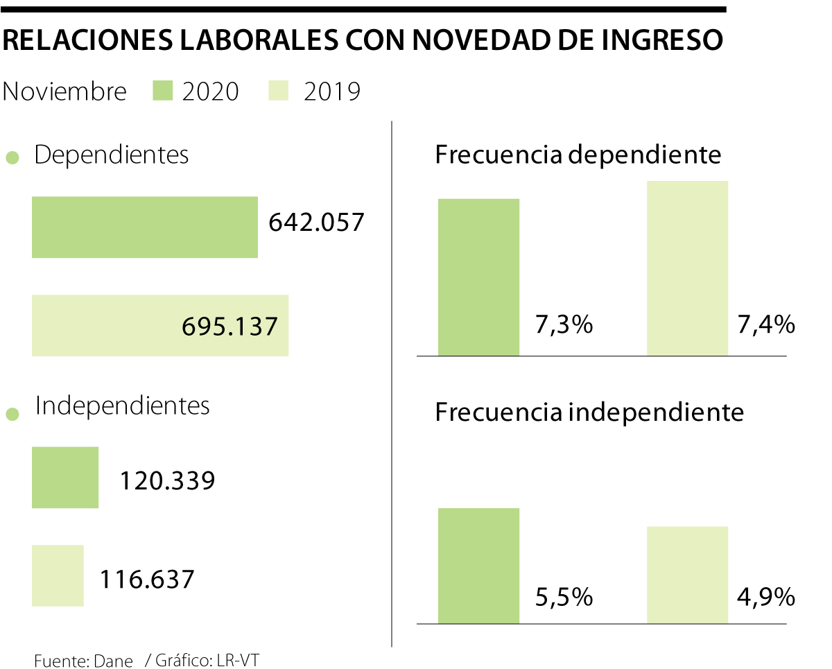 En cuanto a los puestos de trabajo independientes, 5,5% tuvo esa misma novedad en noviembre de 2020 y esta proporción había sido de 5,9% en octubre y septiembre cada uno, y de 5,3% en agosto.