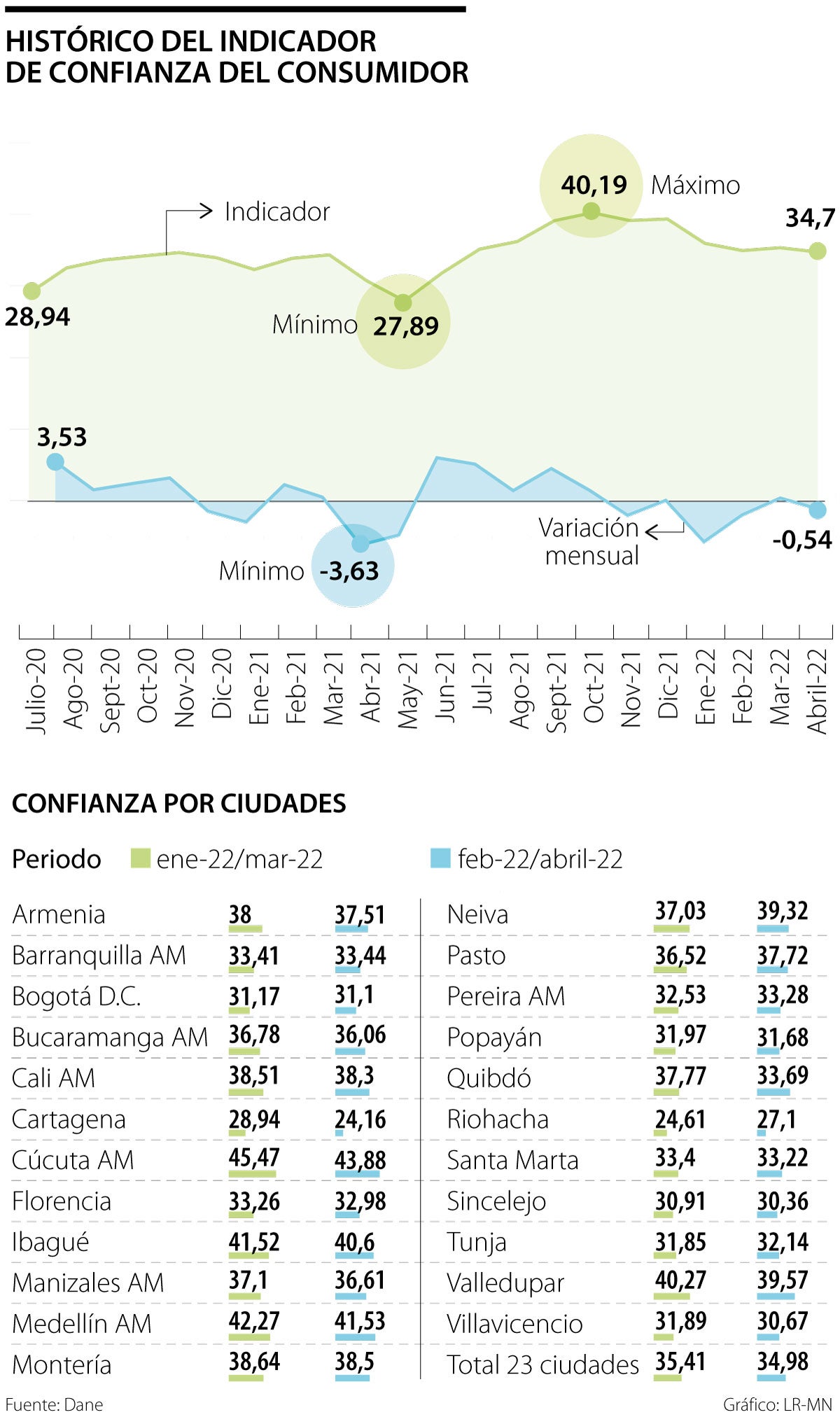 El Departamento Administrativo Nacional de Estadística (Dane), informó que el Indicador de Confianza del Consumidor había llegado a 34,7 durante abril, lo que representa una caída de 0,6 puntos. Este está asociado principalmente por el futuro de la economía del hogar.