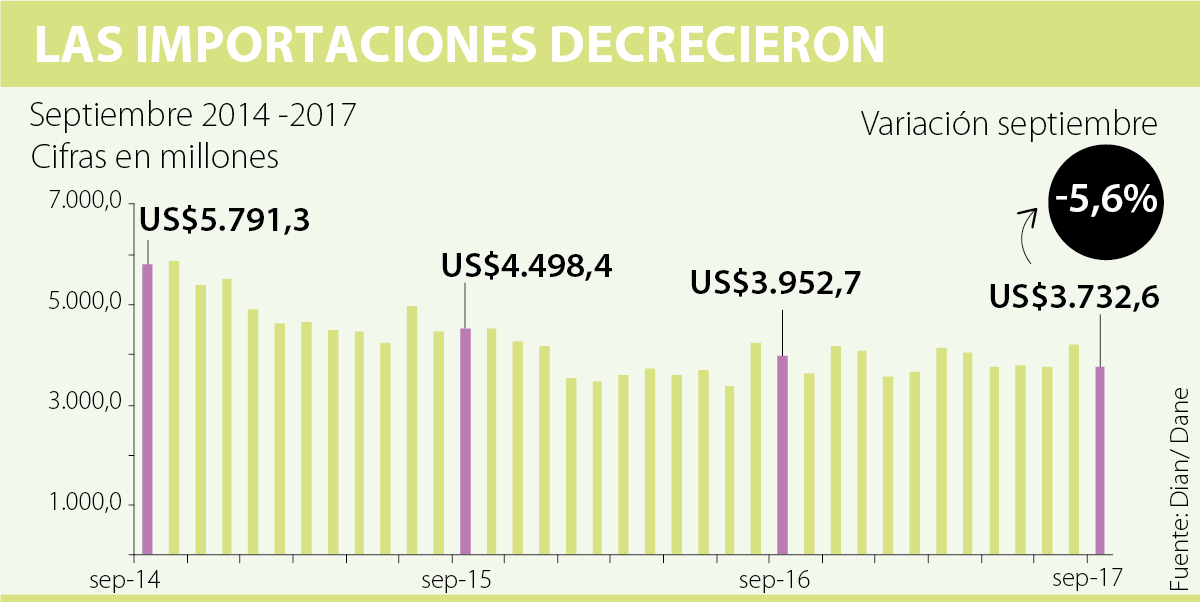 El Departamento Administrativo Nacional de Estadística (Dane) reveló el informe de importaciones para el mes de septiembre, el cual detalló que el valor disminuyó 5,6% respecto a 2016, ya que pasó de US$3.952,7 millones a US$3.732,6 millones.