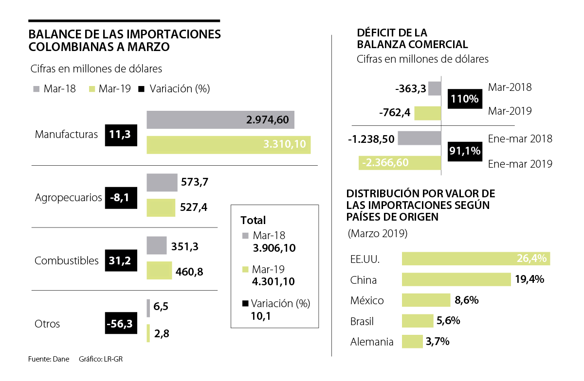 De acuerdo con el informe del Dane, China fue el país desde donde más se importó entre enero y marzo de 2019 debido al alza que tuvieron las compras externas desde ese país de teléfonos celulares, que crecieron 21,7% frente al mismo periodo del año anterior. Además, cabe destacar que entre los mayores aumentos se resaltan los que tuvieron los vehículos para el transporte de personas desde Alemania (34,8%), los aviones entre 2.000 kg y 15.000 kg desde Francia (448%) o los gasóleos traídos desde Estados Unidos. (319%).