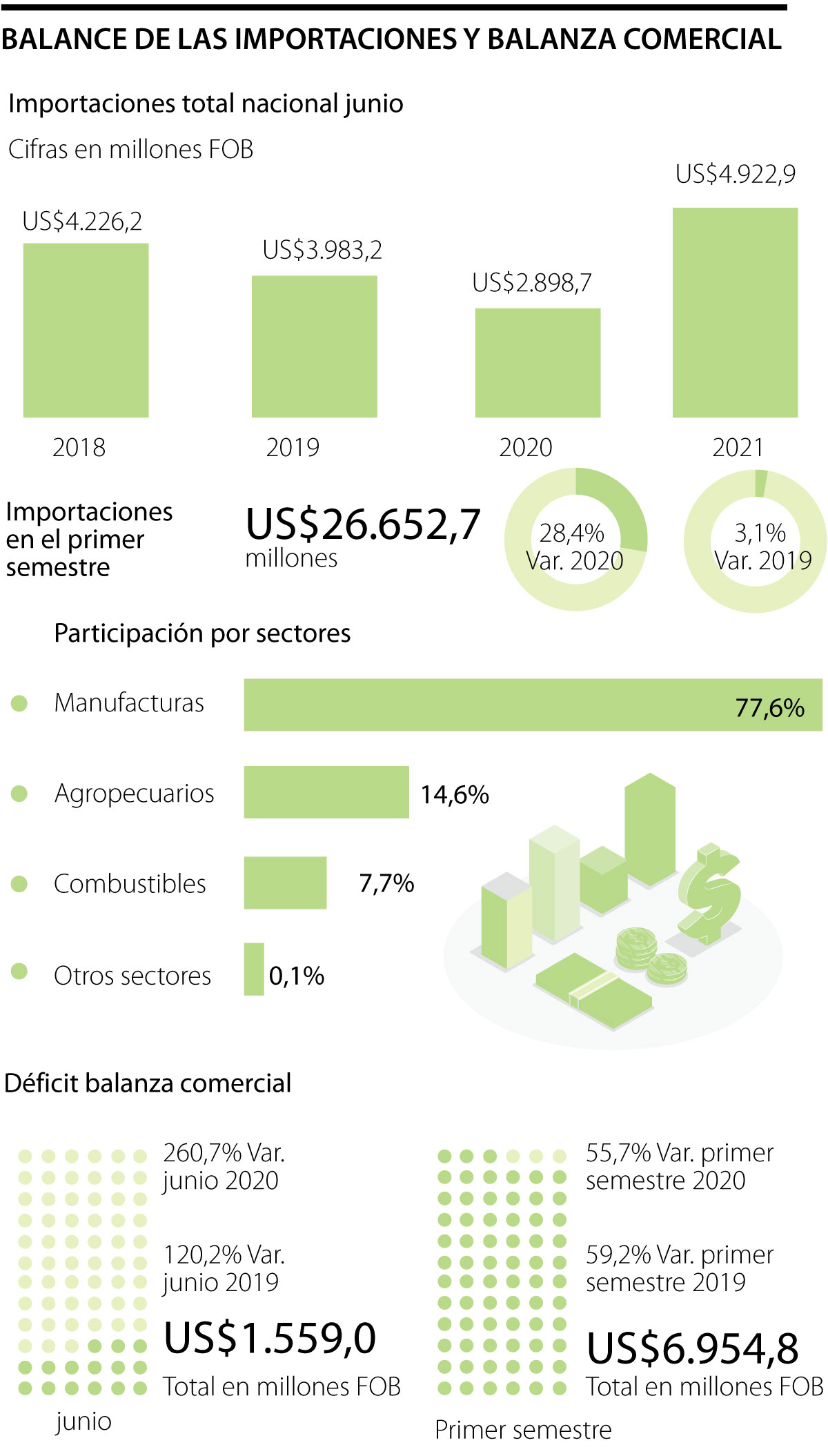Las importaciones a junio totalizaron US$26,652,7 millones, 28,4% más frente a los primeros seis meses de 2020 y 3,1% frente a 2019