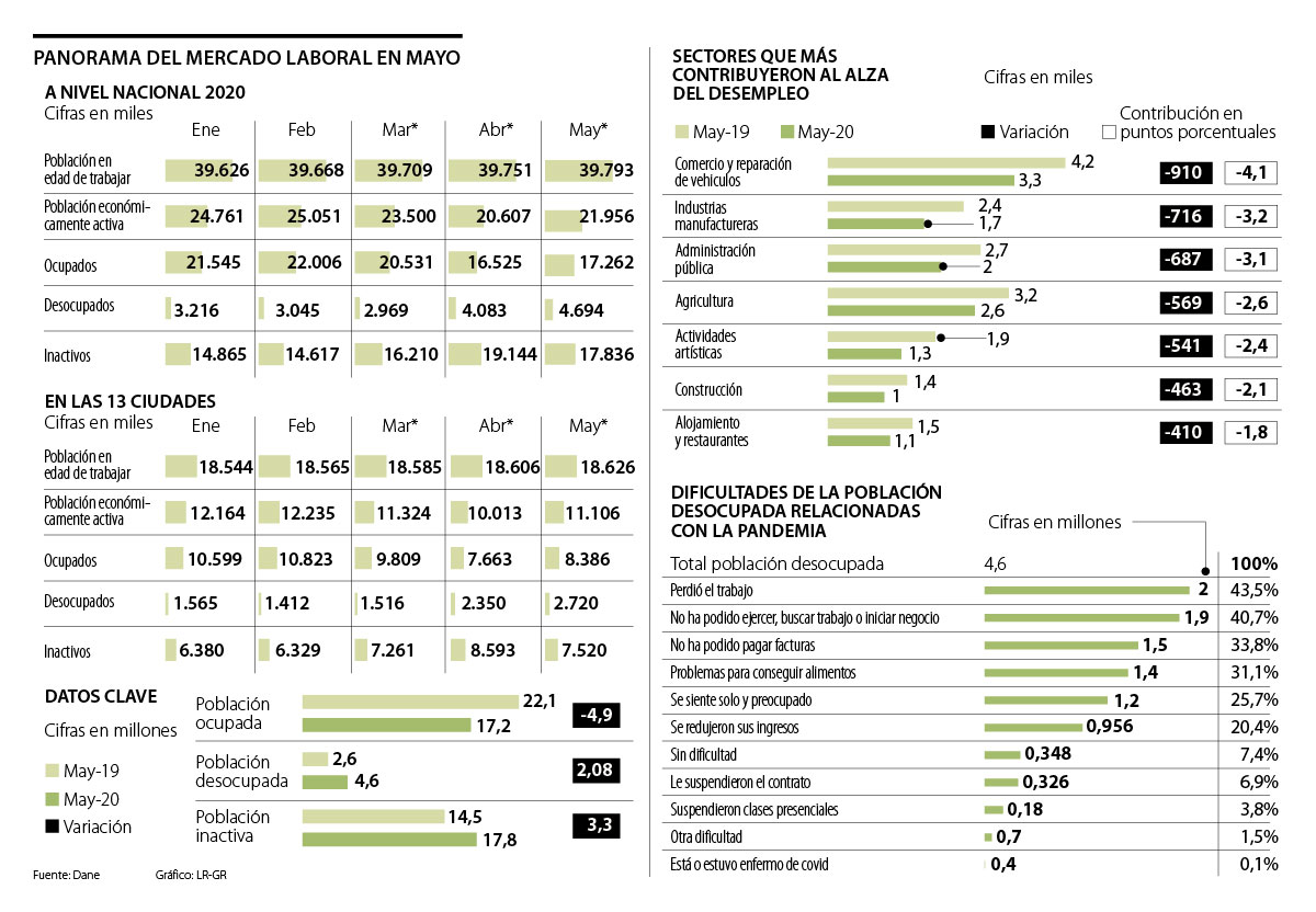 De acuerdo con el Dane, de más de 2 millones de empleos que se perdieron en mayo en las 13 ciudades, 1,2 millones eran empleados formales y 1,180 millones informales. Además, 40% de los desocupados del total nacional dijo que no ha podido buscar trabajo o montar un negocio por las medidas de confinamiento, e incluso, 33,1% dijo que tiene dificultades para comprar alimentos. Otro dato clave fue que 44% de las personas que continuaron trabajando en mayo en el país señaló tener dificultades económicas.