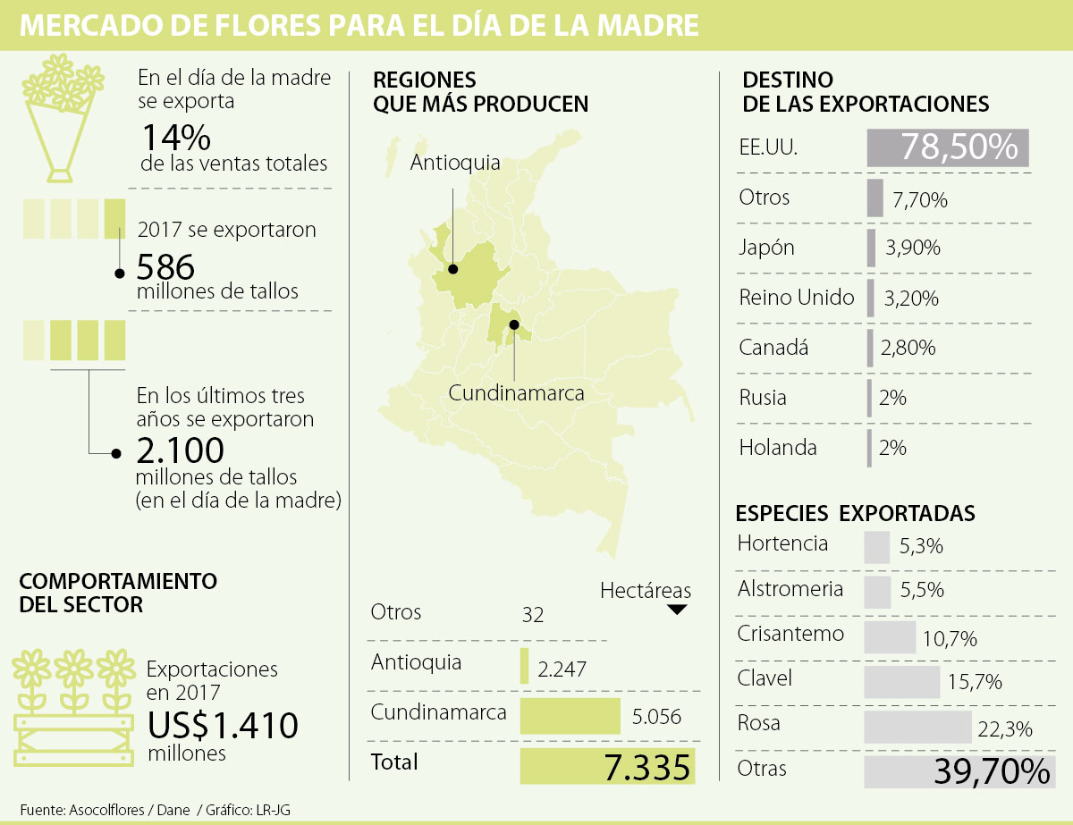 De acuerdo con las estimaciones de la Asociación Colombiana de Exportadores de Flores (Asocolflores), las exportaciones de flores que se hacen en el día de la madre representan 14% de las ventas totales al exterior, siendo Estados Unidos el principal mercado, si se tiene en cuenta que 77% de las flores exportadas para esta fecha son de origen colombianas.