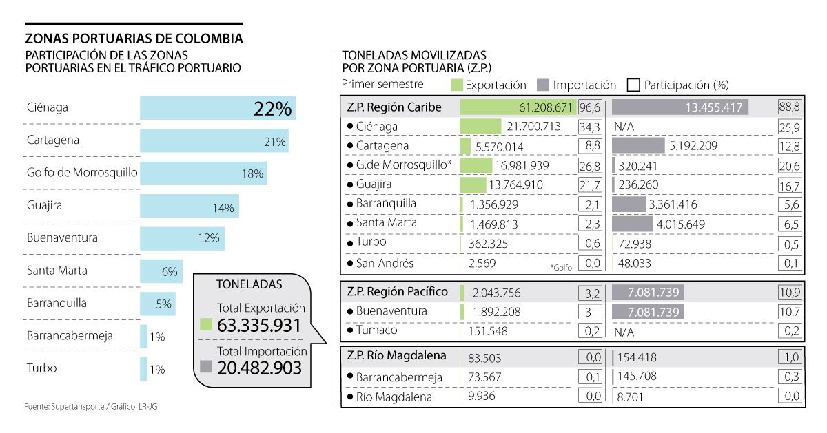 Por otro lado, si bien hay seis terminales, en el puerto la operación se divide prácticamente entre tres: la Sociedad Portuaria de Buenaventura (SPB), el Terminal De Contenedores De Buenaventura (TCBuen) y la Sociedad Industrial Puerto Aguadulce. De acuerdo con la Cámara de Comercio de Buenaventura, de 25 millones de toneladas que se movilizaron por la bahía, la SPB fue responsable de 16,14 millones de toneladas, 64,5% del total; la carga de TCBuen llegó a 3,3 millones de toneladas (13,2%), mientras que la Sociedad Industrial Puerto Aguadulce transportó 1,69 millones de toneladas (6,7%).