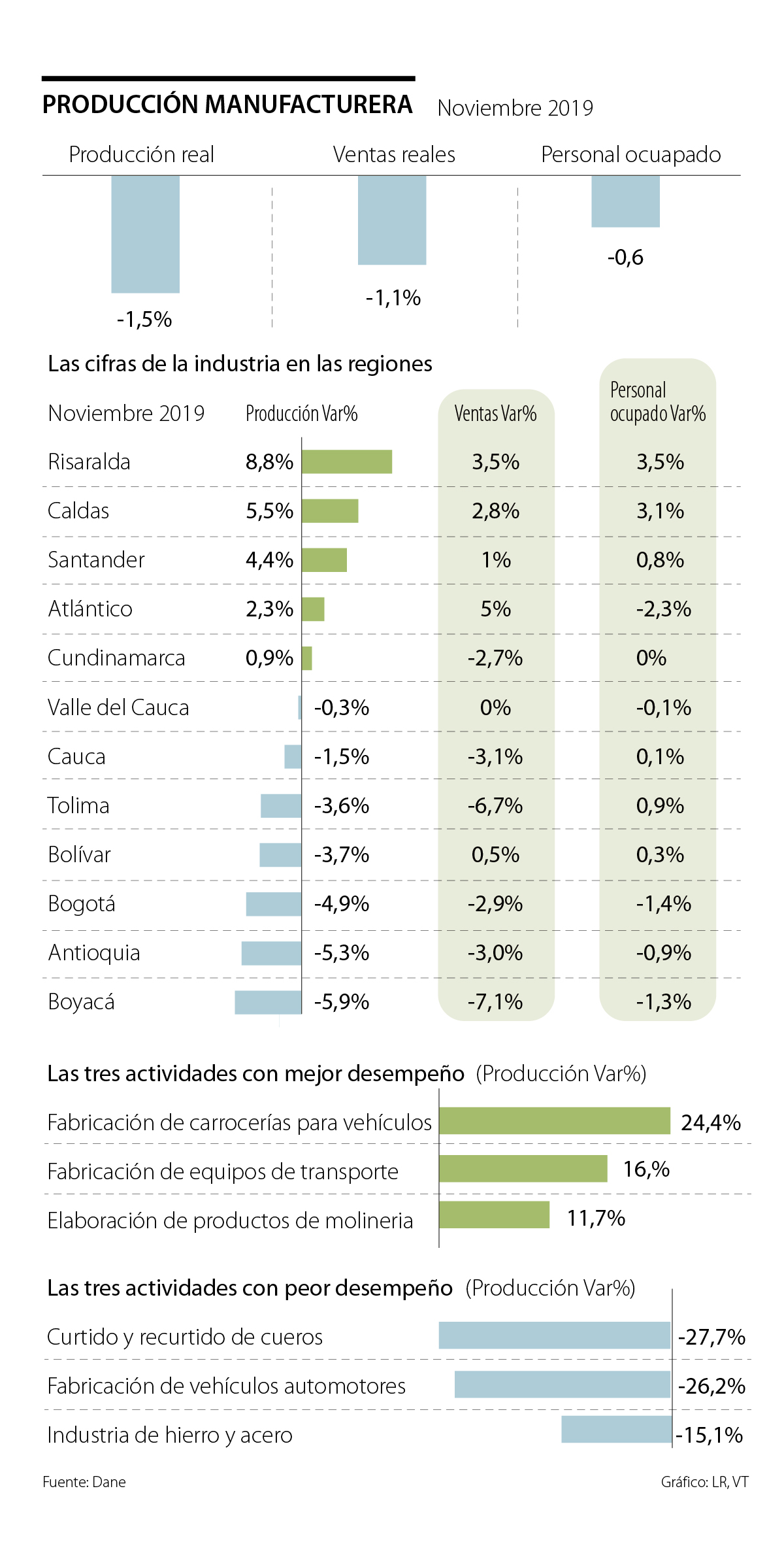 En lo corrido del año, la producción total de la industria sí tuvo un leve crecimiento de 1,3% y una variación positiva de 2% en las ventas. Risaralda, en ese periodo, siguió siendo líder de las regiones con un alza de 9%, seguida por Boyacá, con 6,2%; Atlántico, con 4,5%, y de cuarto quedó Caldas, con 4,1%.