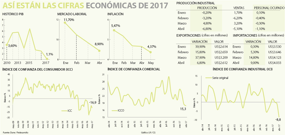 Esto luego de que en el primer trimestre de 2017 el Producto Interno Bruto (PIB) creció 1,1%, respecto al mismo periodo de 2016, y que algunas cifras como la confianza al consumidor y empresarial presentaran cifras negativas.