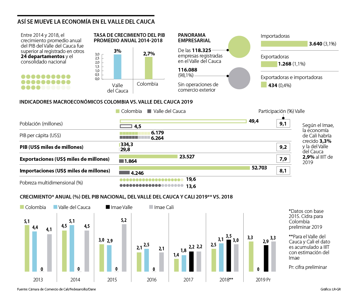 Por otro lado, según el Indicador Mensual de Actividad Económica (Imae), diseñado por la Universidad Javeriana Cali y el Banco de la República, la economía de Cali habría crecido 3,3% y la del Valle 2,9% al tercer trimestre de 2019.