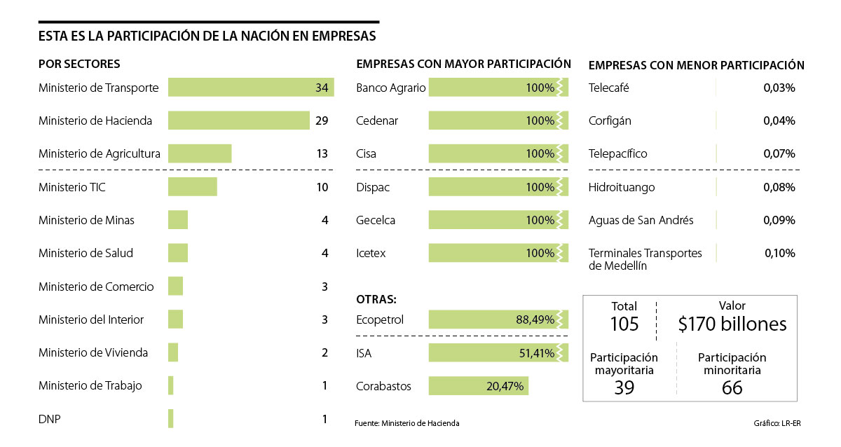 Eso significa que a parte de las ya nombradas posibles enajenaciones de 8,9% de Ecopetrol o 51,41% de ISA, el Gobierno también tiene la posibilidad de privatizar desde la Financiera de Desarrollo Nacional (73,37%) hasta Finagro (65,34%), Telecaribe (40,57%) o Corabastos (20,47%), entre otras.