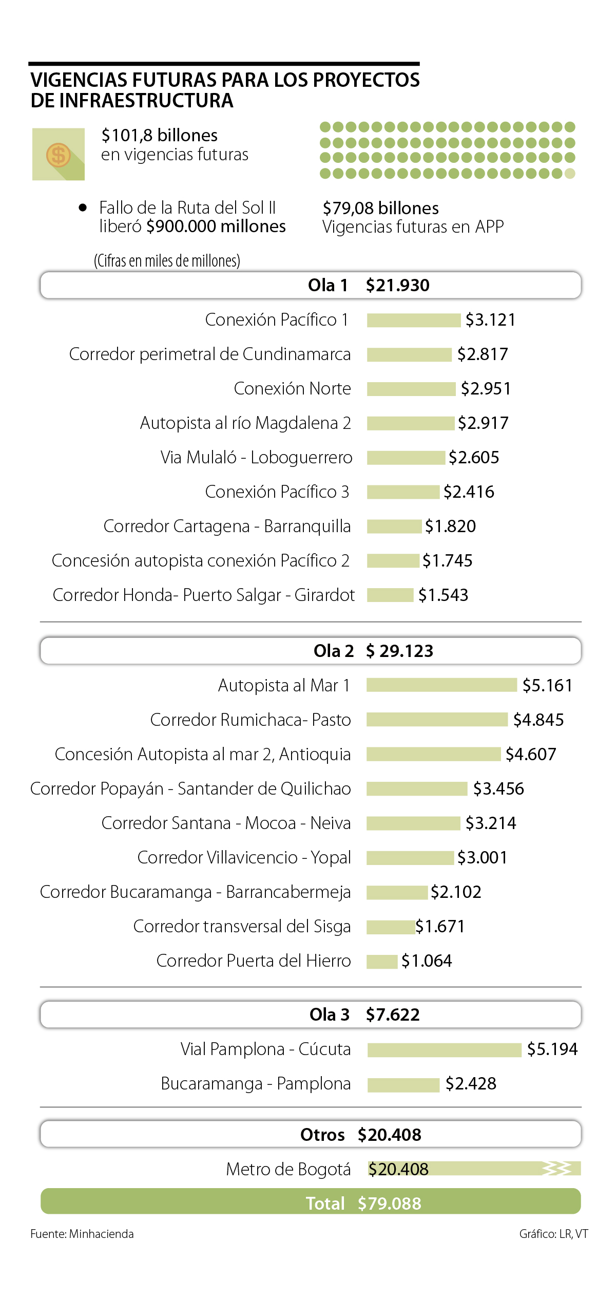 Los casi $80 billones que tiene el país comprometidos a 30 años en vigencias futuras no son el único rubro de inversión, pues en ese portafolio también aparecen proyectos de vivienda, hacienda, defensa y educación. No obstante, la mayor parte está comprometida en vías 4G y en el metro de Bogotá, que tiene un presupuesto de $20,4 billones. Aún así, son las vías de la primera y segunda ola del programa de 4G las que tienen compromisos por $50 billones.