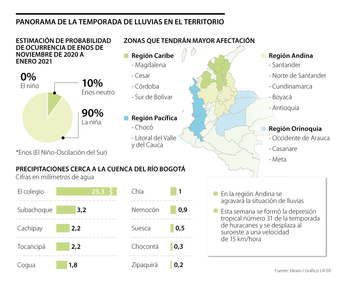Estos pronósticos lanzados por el Ideam son respaldados por la Organización Meteorológica Mundial (OMM), la cual advierte que, entre este final de 2020 y principios de 2021, el episodio de la Niña pase de moderado a intenso. Incluso, las cifras dicen que hay 90% de probabilidad de que este fenómeno natural de lluvias se produzca a lo largo del océano Pacífico tropical.