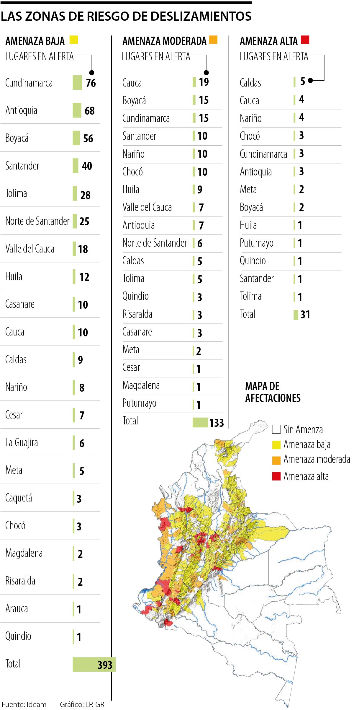 A la fecha, según reporta el Ideam, hay más de 500 zonas del país en riesgo, de las cuales son los departamentos de Cundinamarca, Boyacá y Antioquia los que presentan más casos, con 245 entre los tres, estos se dividen en amenaza baja, moderada y alta; y solo en lo que tiene que ver con alerta roja, la mayoría está en Caldas, Cauca y Nariño.