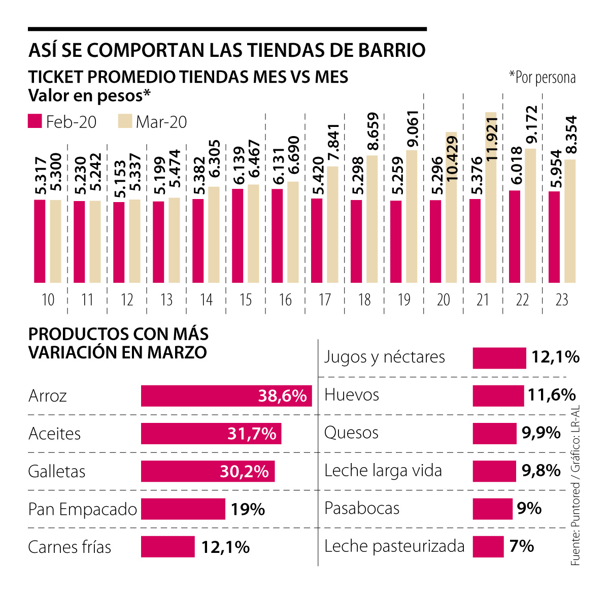 De acuerdo con Sergio López Gaitán, vicepresidente de Puntored, el valor de la compra diaria en tiendas del país aumento significativamente durante el fin de semana debido a los avisos dados por el Gobierno. “Sin embargo, durante el 22 y 23 de marzo empezó a bajar, a $9.100 y $8.300, porque la gente ya compró lo que tenía que comprar. La cantidad en transacciones disminuyó, pero el precio de cada compra aumentó 30%”, dijo.