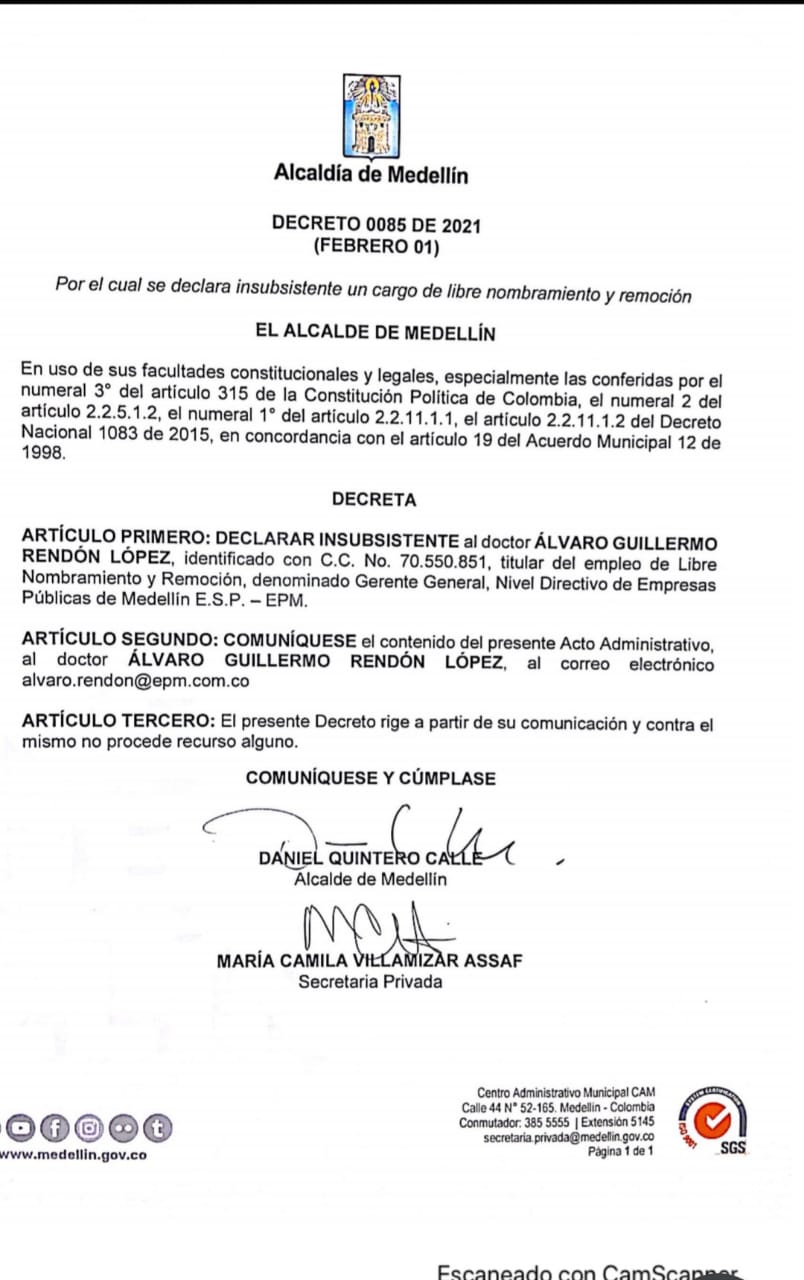 A través del decreto 0085 del 1 de febrero de 2021, la Alcaldía de Medellín declaró al gerente general del Grupo Empresas Públicas de Medellín (EPM) como insubsistente a su cargo.