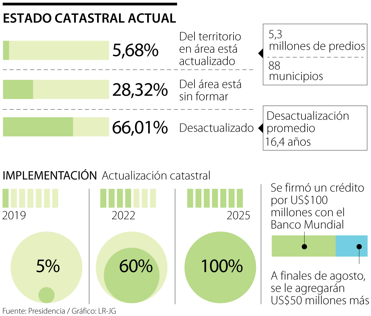 La implementación de la nueva política del catastro multipropósito iniciará este año, luego de que el Gobierno Nacional y el Banco Mundial firmaran un crédito por US$100 millones, monto que aumentará US$50 millones más a finales de agosto. La meta de la administración de Iván Duque es que el catastro esté actualizado completamente en 2025.
