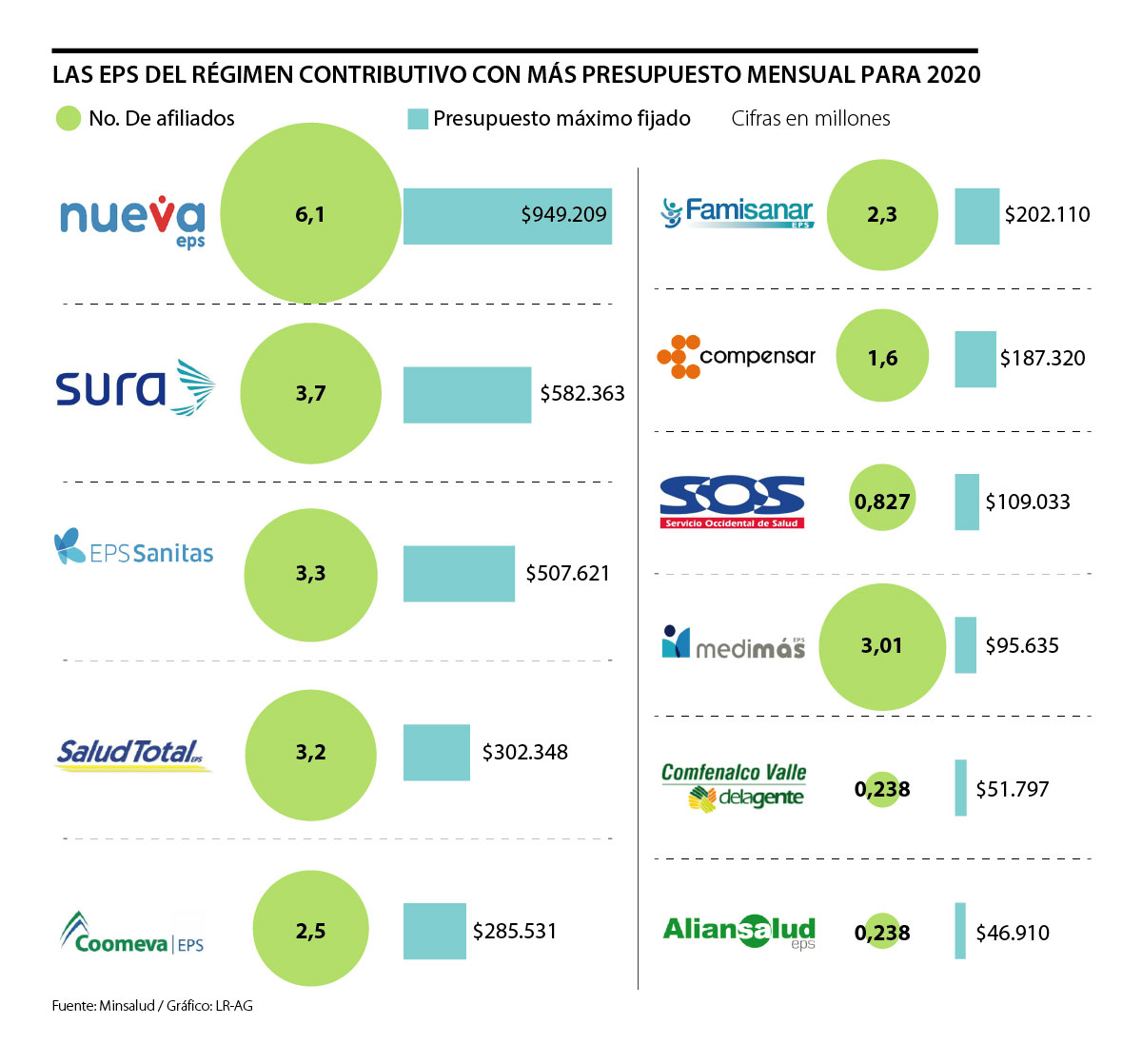 La Adres implementará un sistema de seguimiento a la ejecución de los recursos transferidos a las EPS por concepto de los ‘presupuestos máximos’ para garantizar la suficiencia de los recursos y la prestación de los servicios de salud, según explicó el Minsalud. Cabe señalar que las EPS que prestan servicios al régimen contributivo con mayor presupuesto mensual delegado son Nueva EPS, con una suma de $949.000 millones y Sura, con $582.000 millones. Medimás está en noveno lugar, al aparecer dos veces en la lista y sumar $95.000 millones, aunque no es claro por qué figura repetidamente en la lista de la cartera.