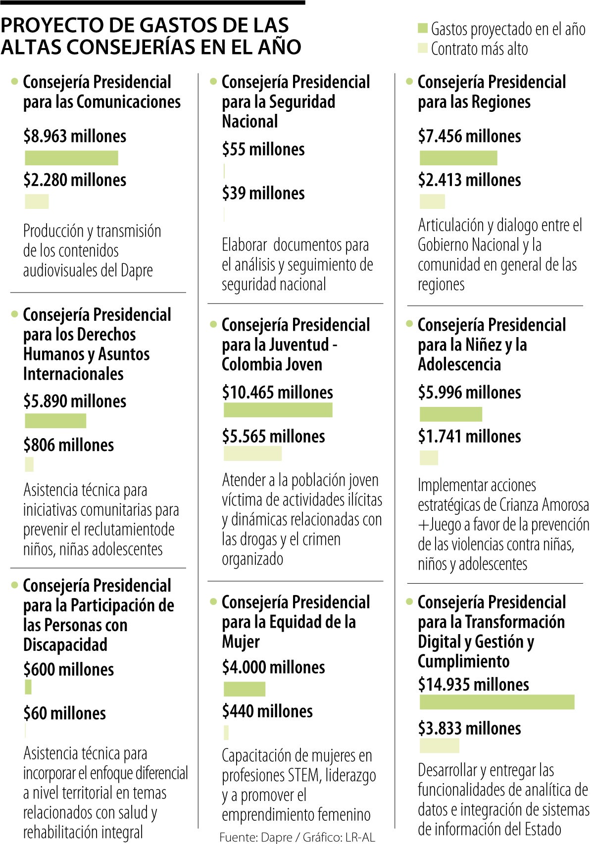 Otra, como la Consejería Presidencial para la Juventud - Colombia Joven tiene proyectados gastos por $10.465 millones para este año, pero más de la mitad de estos recursos se plantean para un solo contrato. $5.565 millones se emplearán para atender a la población joven víctima de actividades ilícitas y dinámicas relacionadas con las drogas y el crimen organizado.