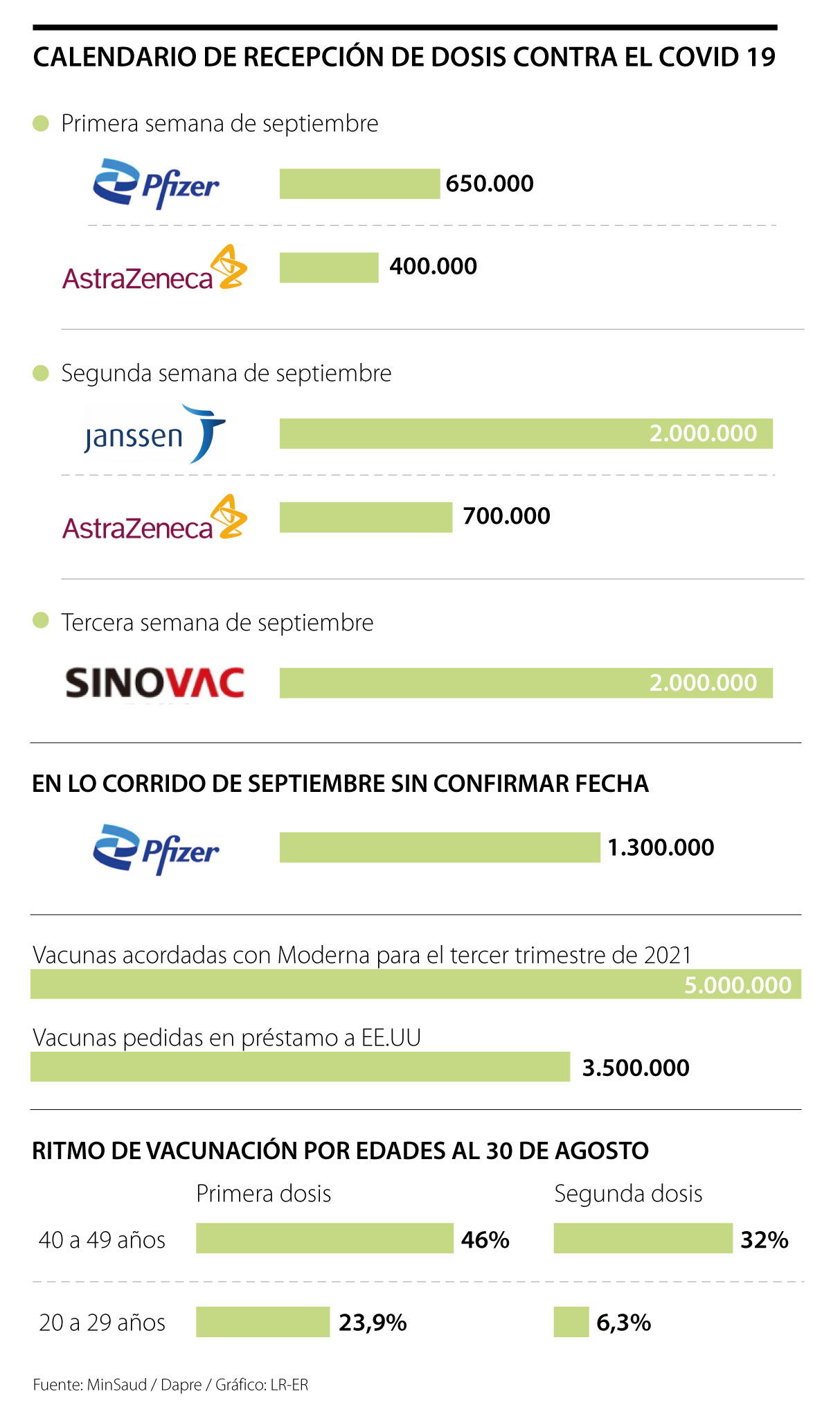 De acuerdo con Víctor Muñoz, director del Dapre, “esta semana recibiremos 650.000 dosis de Pfizer, la siguiente semana llegan 1,1 millones de AstraZeneca, 2 millones de Sinovac, 2 millones de Janssen, y Pfizer también confirmó una entrega de 1,3 millones de dosis en lo corrido de septiembre”, dijo el funcionario.