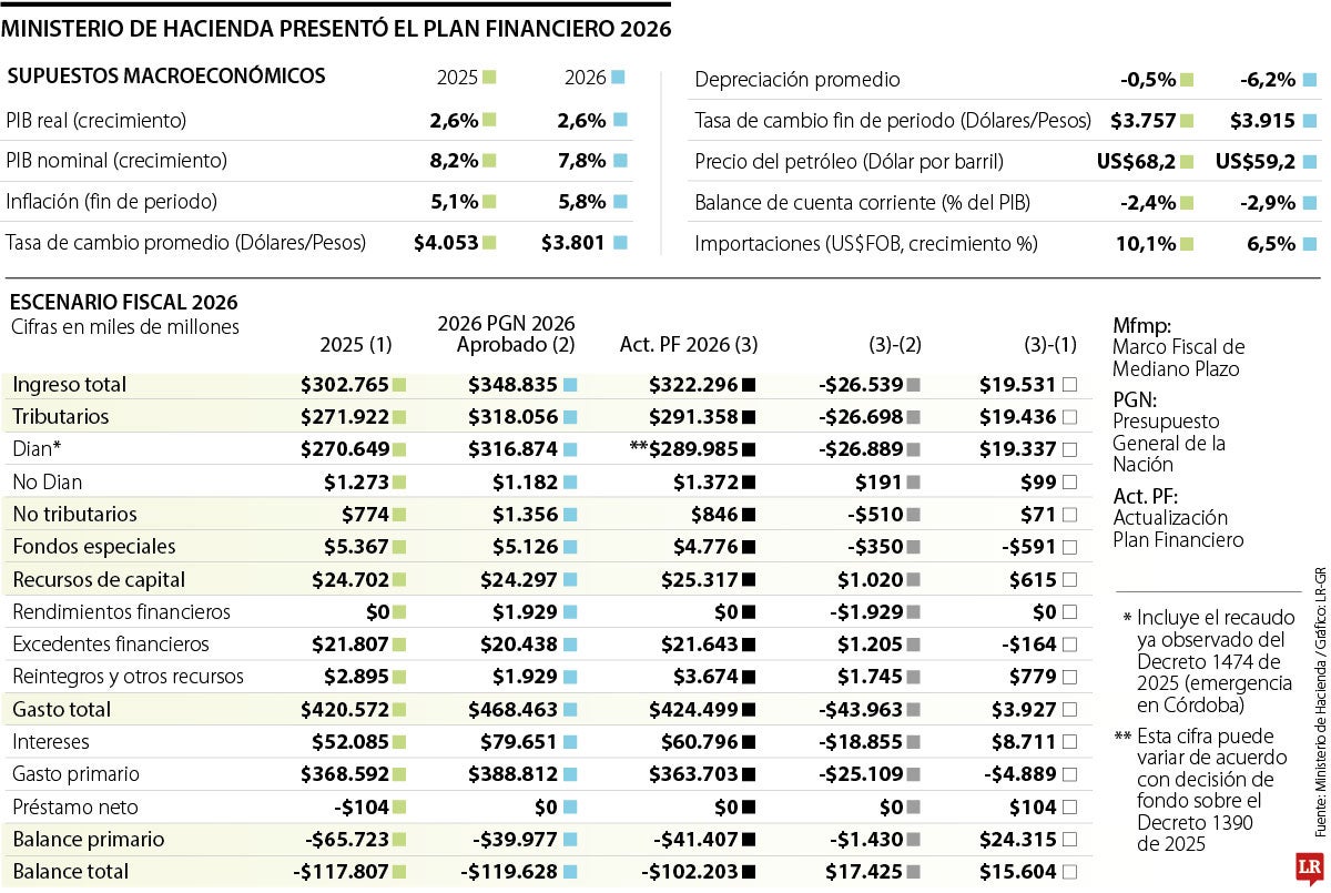 El Plan Financiero contempla un crecimiento de 2,6% para este año; una inflación de 5,8% (0,7 puntos porcentuales por encima del año anterior); una tasa de cambio promedio de $3.801, que cerraría el año en $3.915; una depreciación del peso colombiano de 6,2%; un barril brent en US$59,2; un balance de cuenta corriente de -2,9%; y un crecimiento de importaciones de 6,5%, inferior al de 2025, que estaba en 10,1%.