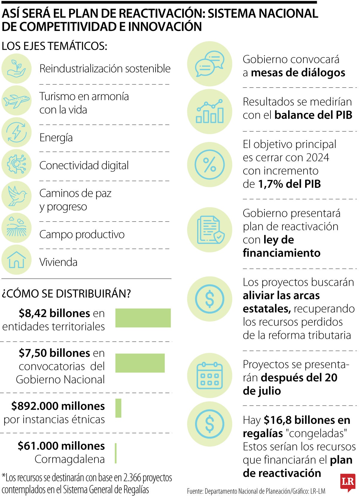 El Departamento Nacional de Planeación presentó los ejes temáticos que abordará la política de reactivación económica, y que toca sectores industriales, turísticos, de vivienda, energéticos, agropecuarios y de construcción. Aunque la iniciativa está en una etapa de socialización, el presidente Gustavo Petro anunció que esta se presentará con la ley de financiamiento.