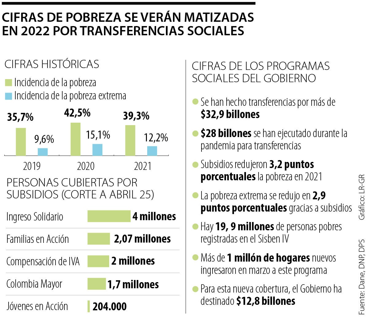 Una de las herramientas que se desarrolló fue el Ingreso Solidario, un subsidio cuya intención es cubrir a aquellas personas que estuvieran en los primeros niveles de ingresos según el Sisben, pero que no estuvieran cubiertas por otro subsidio (Familias, en Acción, Jóvenes en Acción o Adulto Mayor). El país ha avanzado en la recuperación de personas que cayeron durante 2020 a la condición de pobreza, pero no logró reversar el impacto visto en 2020. Si bien el año pasado 1,4 millones de personas salieron de esta condición, el rezago frente a 2019 es de 2,15 millones de habitantes, explicó el Dane.