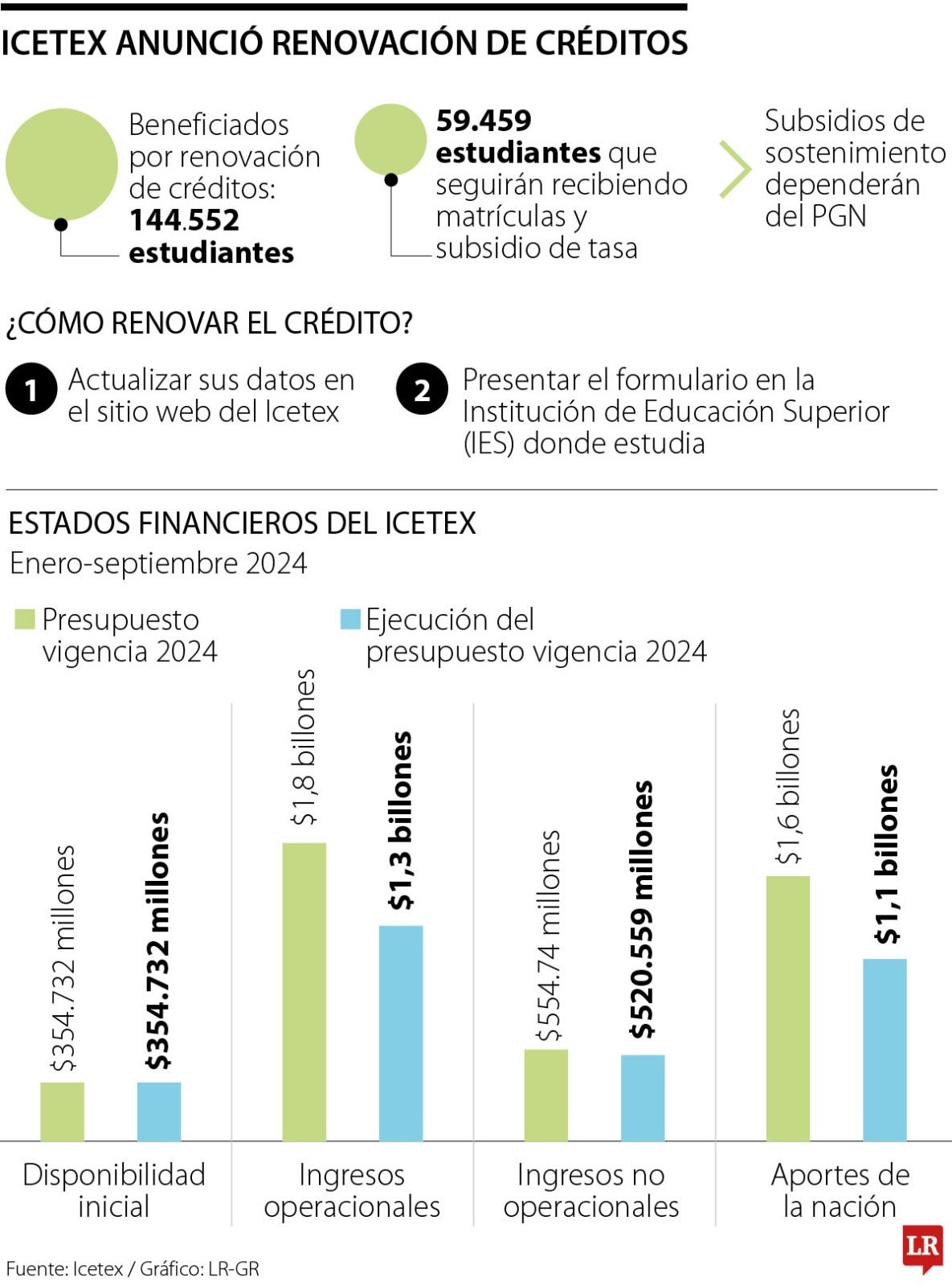 “Los 144.552 créditos educativos de Icetex susceptibles de renovación pertenecen a líneas de crédito reembolsables de largo, mediano y corto plazo, tanto pregrado como posgrado dentro y fuera del país, así como pasantías e idiomas, que son financiados con recursos propios de la entidad”, dijo la entidad.