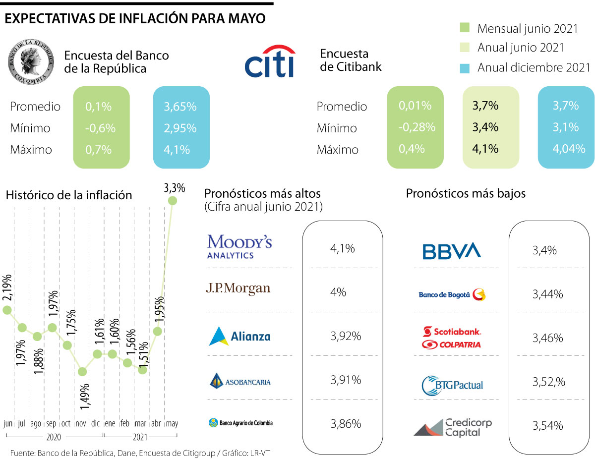 Aunque los bloqueos viales que tuvieron lugar en medio del paro nacional han dejado de producirse y los sectores económicos han hecho esfuerzos para mitigar los choques de la situación provocada por los problemas de orden público del país, los analistas de 25 entidades que participaron en la encuesta de proyecciones del Citi indicaron, en promedio, que esperan que la inflación anual de junio aumente a 3,7%.