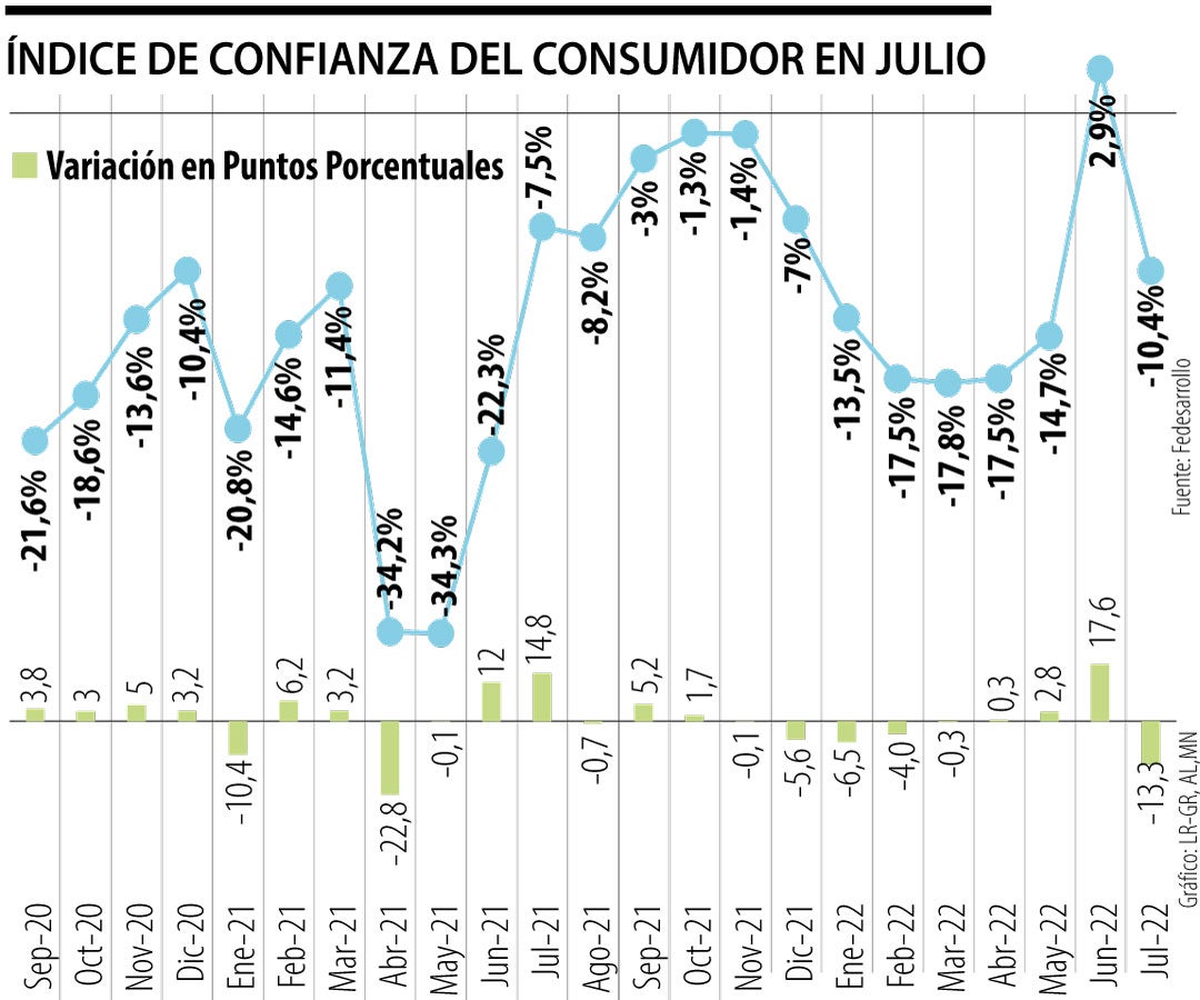 De acuerdo con la Encuesta de Opinión del Consumidor elaborada por Fedesarrollo para el mes de julio, el Índice de Confianza del Consumidor presentó una contracción de 13,3 puntos porcentuales (pps), con lo que se ubicó en -10,4%.
