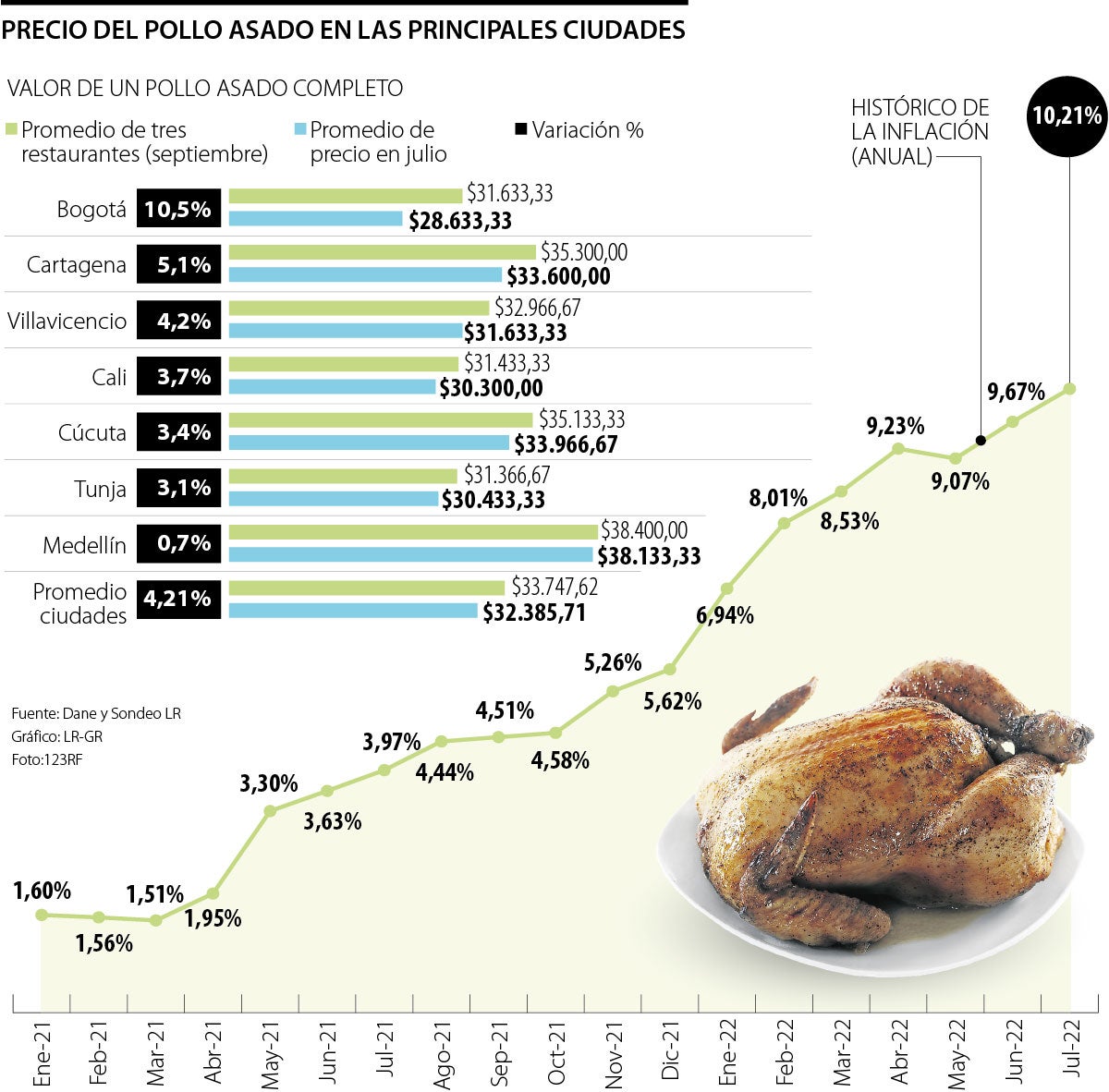 En el marco del Festival del Pollo Colombiano, que comenzó durante esta semana, LR presenta una nueva edición del Índice del Pollo Asado, un indicador que mide la variación de precios con base a este plato que se consume en todas las regiones. Este mes se vio un incremento de más de 4% tras consultar las principales ciudades del país.
