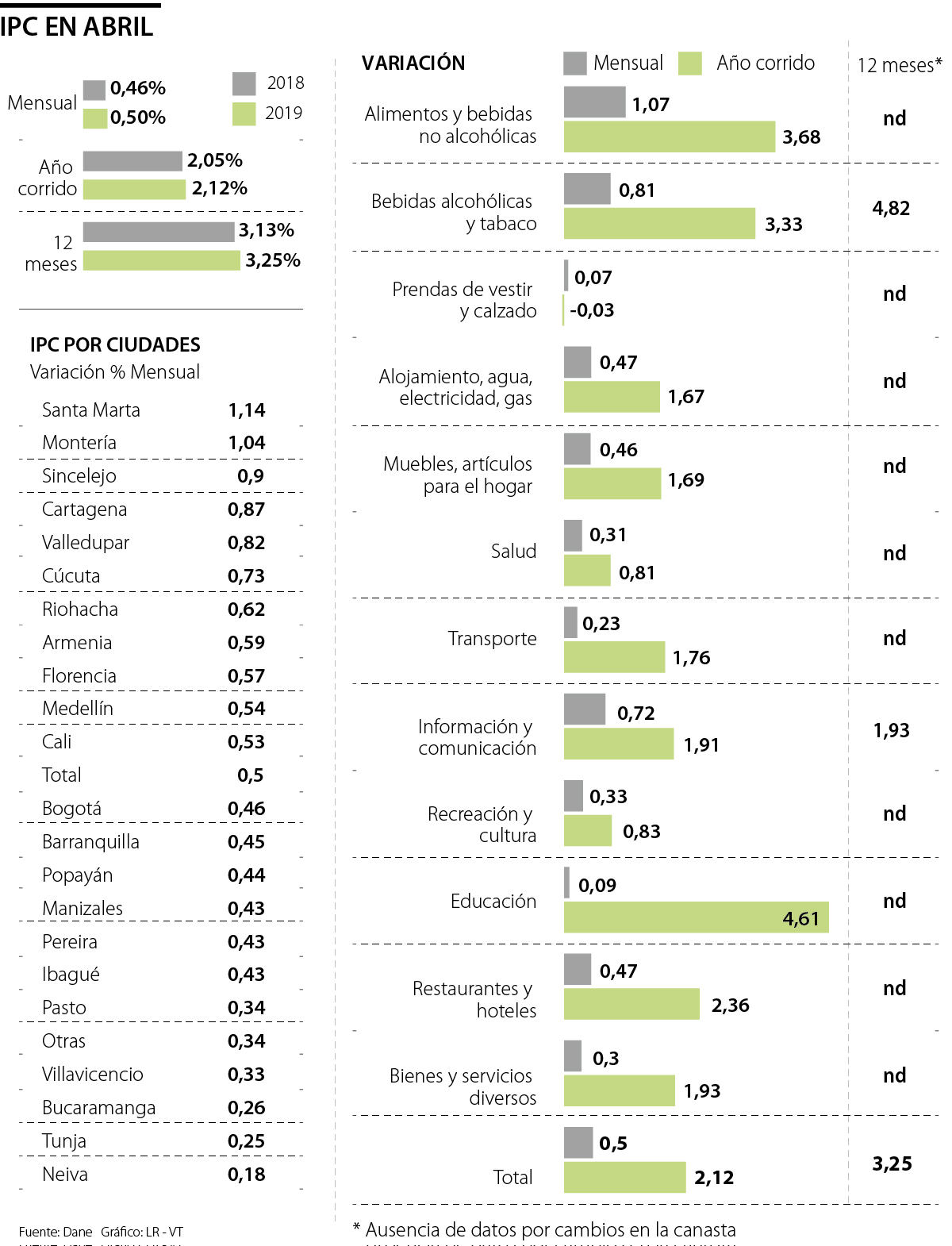 El Índice de Precios al Consumidor (IPC) para abril de 2019 registró una variación de 0,50% en comparación con marzo y presentó una variación de 3,25% en comparación con abril de 2018. Así lo informó el Departamento Administrativo Nacional de Estadística (Dane).