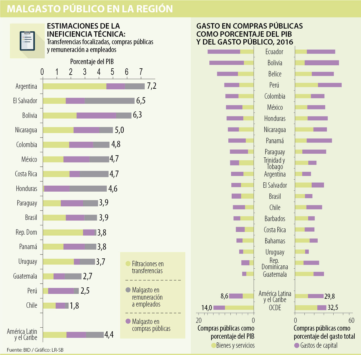Esta cantidad de recursos pone a Colombia como el quinto país de la región en el que más se pierde por ineficiencia en el gasto, solo superado por Argentina (7,2% del PIB), El Salvador (6,8% del PIB), Bolivia (6,3% del PIB) y Nicaragua (5% del PIB). El gasto ineficiente colombiano está muy por encima de los más bajos de la lista, como los de Chile y Perú (1,8% del PIB y 2,5% del PIB, respectivamente), y también está por encima del promedio regional, 4,4% del PIB, lo que en cuentas del BID representa 16% del gasto público de Latinoamérica y el Caribe.