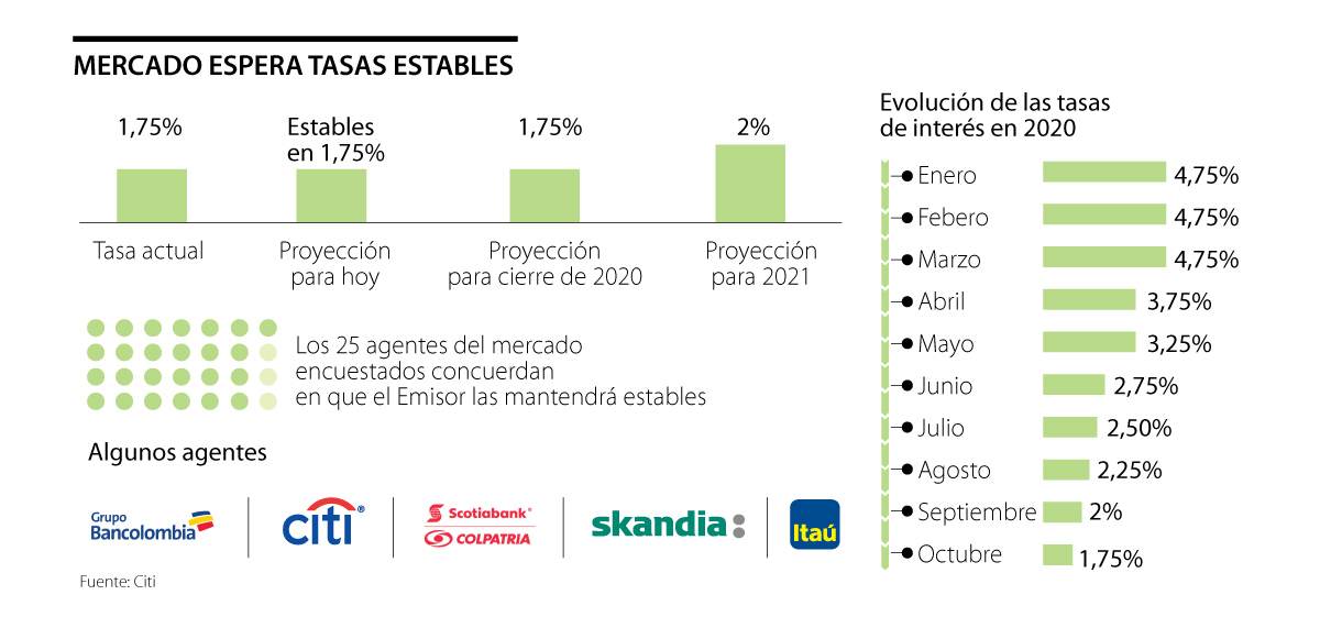 Sin embargo, para los principales agentes del mercado, esta tendencia bajista ya llegó a su fin, por lo menos durante este año, y para hoy esperan que la Junta Directiva del Banco Central mantenga estables las tasas de interés de política monetaria en 1,75%, según la más reciente encuesta de expectativas de Citi.