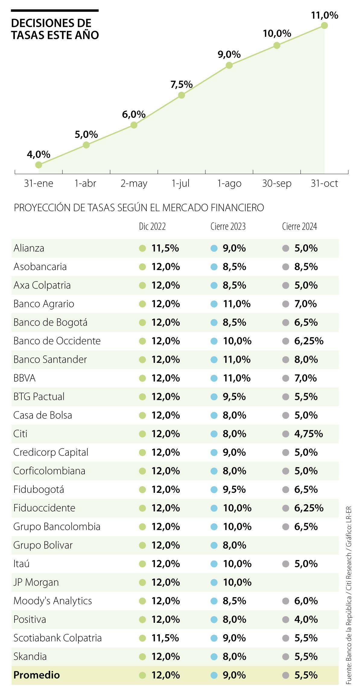 Así se ve en el sondeo del Citi Research, el cual resalta las proyecciones para diciembre de los 23 principales operadores del mercado financiero. Los más conservadores son los analistas de Scotiabank Colpatria y Alianza, quienes creen que el incremento de las tasas será de solo 50 puntos básicos a 11,5%. En cambio las entidades restantes (la gran mayoría) sí ven que el alza del viernes será de 100 puntos básicos.