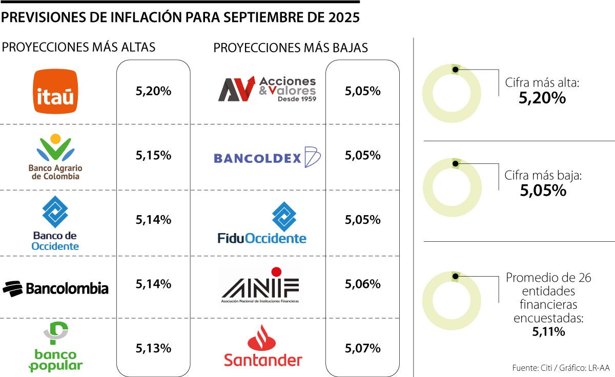 Las máximas proyecciones para este periodo llegan a 4,64% y las mínimas a 3,40%. En caso de que se cumplan estas últimas, este indicador macroeconómico solo alcanzaría a llegar a las cifras meta del Banco de la República a finales de 2026, razón por la cual la entidad eligió mantener estables sus tasas en septiembre.
