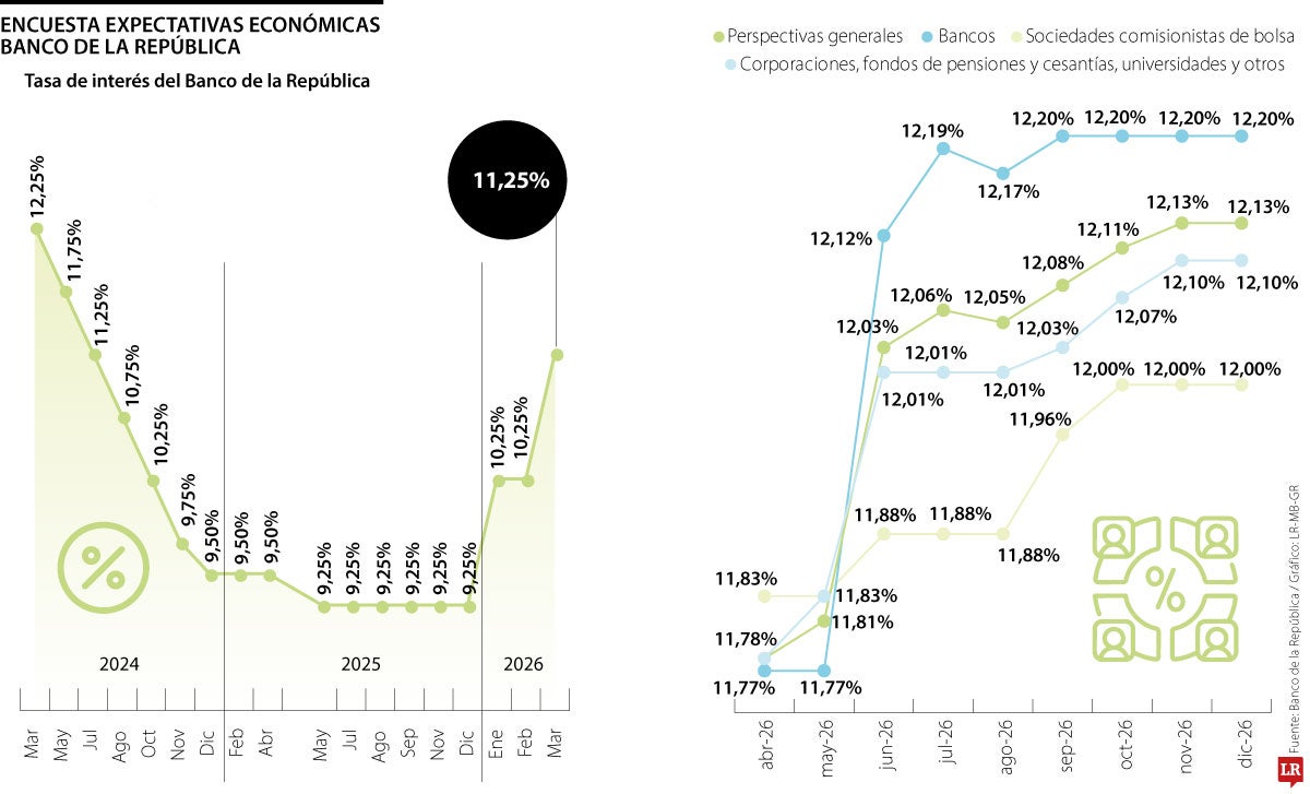 Por su parte, desde el Banco de Occidente, la perspectiva es similar a las expectativas presentadas por el Emisor, ya que esperan que la tasa se ubique en 11,75%. “Estamos esperando un incremento de 50 puntos básicos en la tasa de interés, de 11,25% a 11,75%. En buena medida, esto responde al comportamiento de la inflación, que volvió a acelerarse”, señaló David Cubides, economista jefe del banco.
