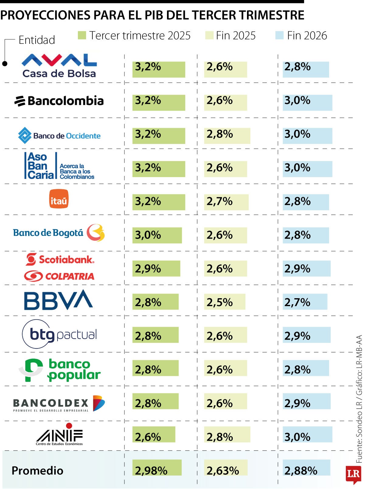 En la parte más baja está Anif, que también estima que la economía va a continuar su senda de crecimiento y cerrará el año en 2,8% anual. Para 2026 prevé un crecimiento de 3,0%.