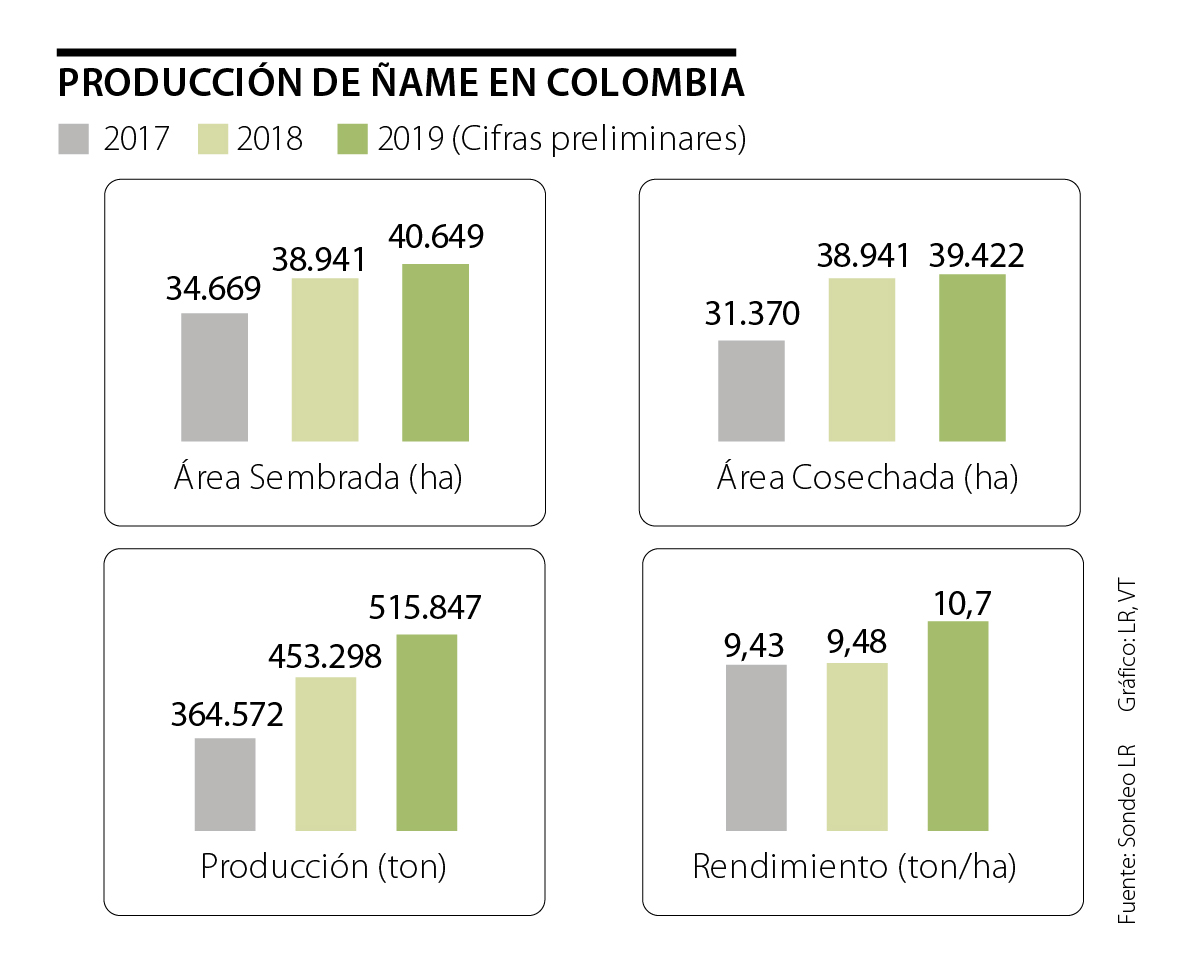 Durante el periodo 2015-2018 las áreas sembradas con cultivos de ñame en el país presentaron un aumento de 10,3%, a partir de un crecimiento promedio anual del 4%. En el mismo periodo las áreas cosechadas reportadas registraron un aumento del 49%.