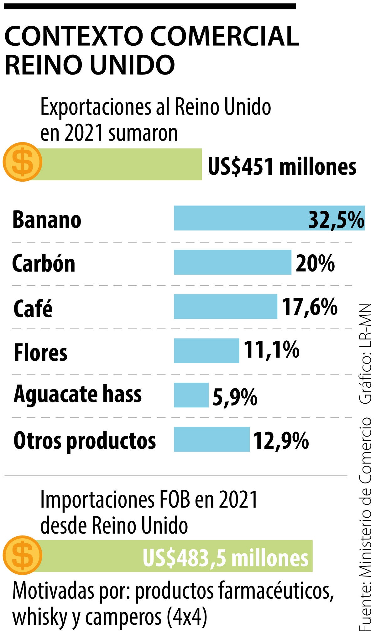 Según el Mincomercio, Reino Unido es “un socio comercial estratégico” para la nación. Durante el año pasado, el intercambio de bienes y servicios arrojó una cifra de US$934,5 millones: Colombia exportó US$451 millones, lo cual representó 1,1% de las ventas del país al mundo y 10,1% de los productos que llegaron a los mercados en Europa.