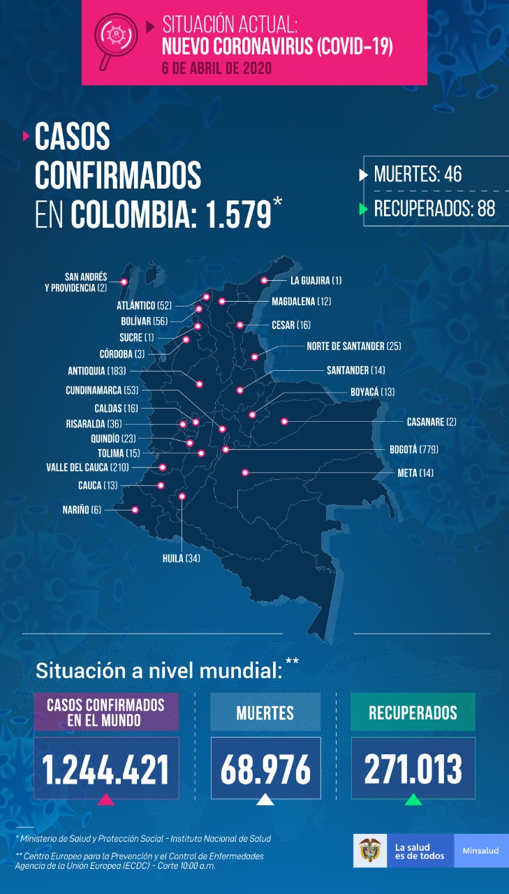 De acuerdo con las cifras del Instituto Nacional de Salud, el total de casos se divide en 804 hombres y 775 mujeres. En el país, se han descartado 26.106 casos, y de los contagiados, hay reporte de 599 casos importados, 499 relacionados y 480 que son 'casos de estudio'.