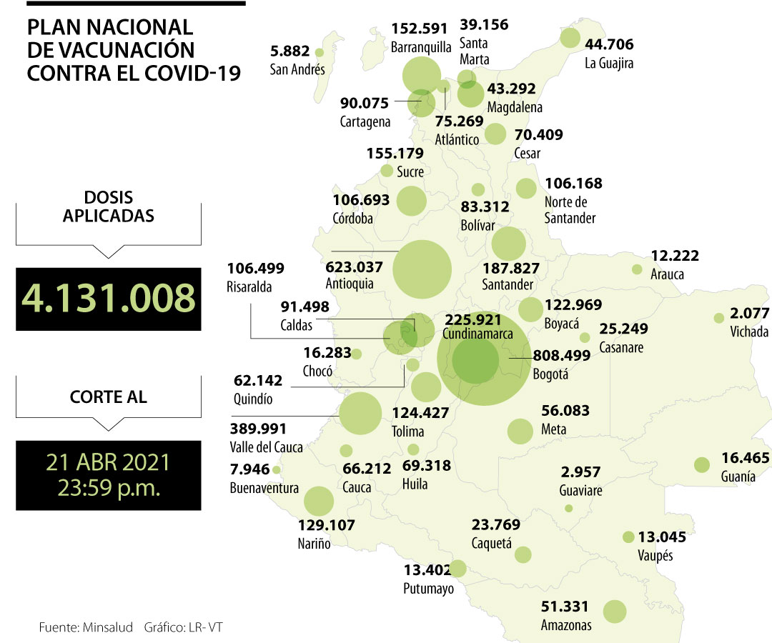 El último balance del Plan Nacional de Vacunación, registra un total de 4.131.008 dosis de la vacuna contra el covid-19 aplicadas en todo el país con corte a las 23:59 del miércoles 21 de abril.