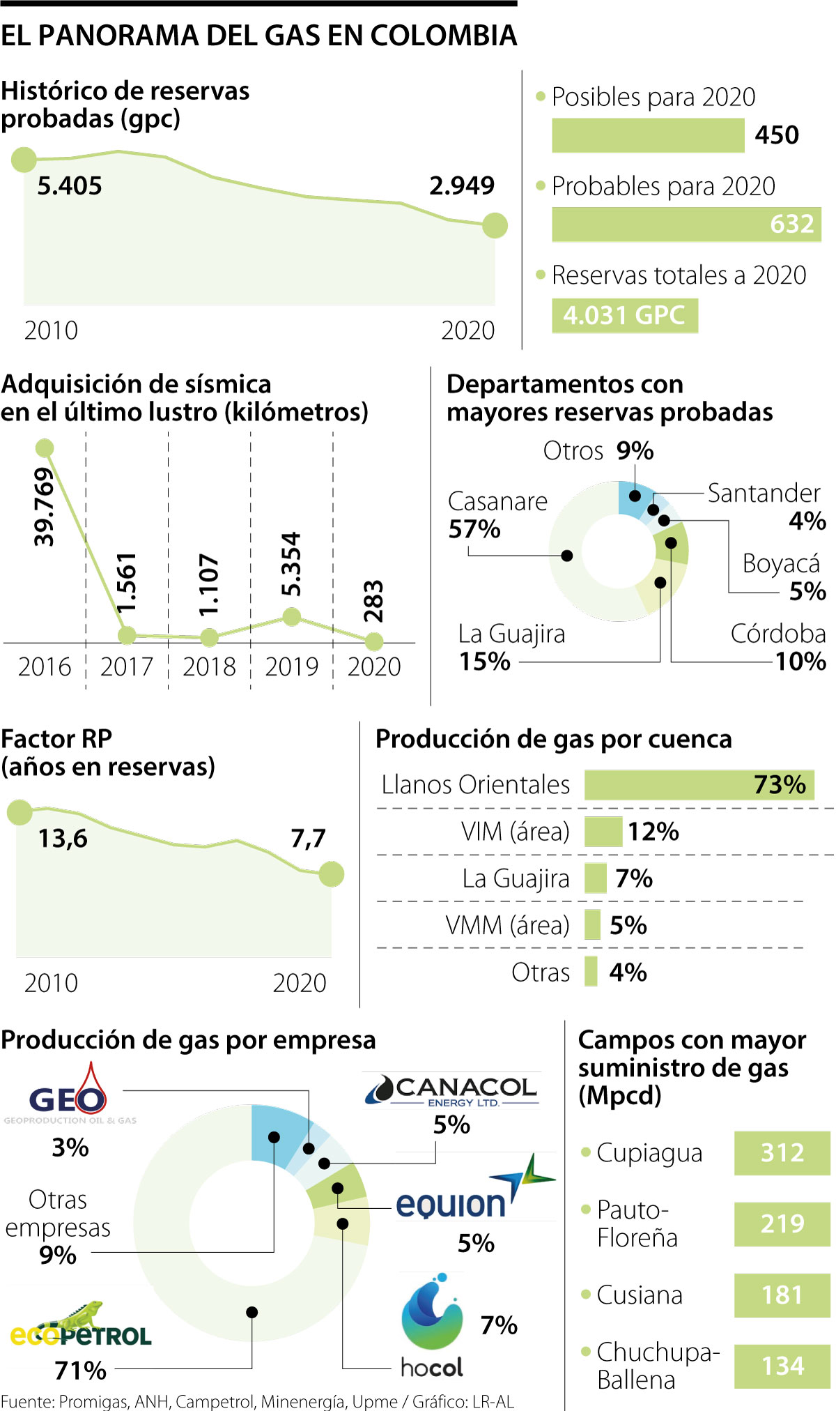 Analizando el tiempo de suministro, 10 años atrás, la autosuficiencia era de 13,9 años; hoy solo se cuenta con 7,7 años, aspecto que preocupa teniendo en cuenta los pocos kilómetros de adquisición sísmica (283), la baja en expectativa de pozos exploratorios y el nivel de reservas posibles y probables, que totalizaron 450 gpc y 632 gpc durante 2020.