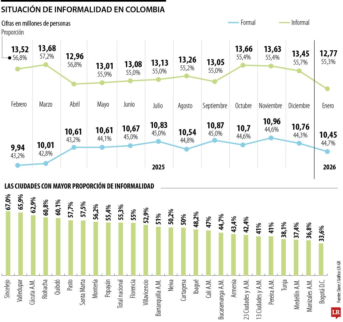 Las cifras del Dane revelaron que, a enero, hay un total de 12,77 millones de personas en la informalidad, una cifra levemente menor a la registrada en el mismo mes del año pasado, cuando llegó a 12,85 millones. En pocas palabras, en un año, apenas disminuyó en 80.000 personas.